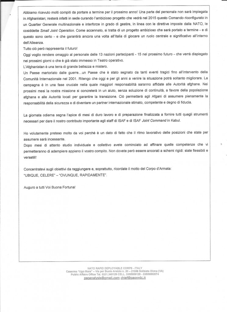 Allocuzione del generale Giorgio Battisti, comandante NRDC-ITA e prossimo Capo di stato maggiore del comando ISAF, oltre che senior national representative del contingente italiano dispiegato in Afghanistan: