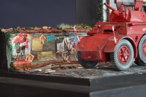I figurini sono due vecchi sopravvissuti di un kit della Bandai degli anni ’70 (nel modellismo niente si butta e tutto si trasforma!!!) che un po’ di stucco e qualche ora di lavoro li ha trasformati nei due celerini al seggio, mentre lo spaccato dell’edificio, la strada e il muretto sono il frutto di un’operazione di fantasia e di scracth serale.